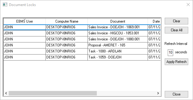 The list will highlight the document lock along with the EBMS User, Computer Name, and Document. Enter the Refresh Interval __ seconds to refresh the lists on a regular interval. Click Apply Refresh to refresh manually.