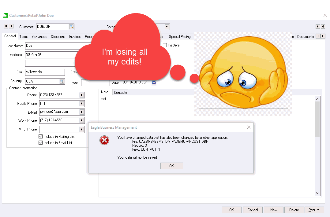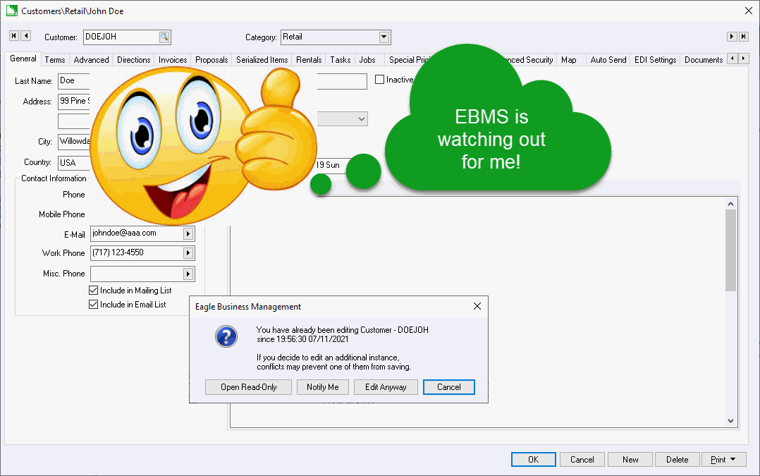 Document locking is a common step done within ERP software when an account or document is opened. For example, a customer record or an invoice is locked when it is being changed so that another user does not make changes at the same. Like all database applications, EBMS uses locking to ensure data consistency. EBMS employs both optimistic and pessimistic locking strategies.