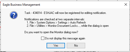 Click NO to have a message appear within EBMS when the document lock is released. Verify that the Refresh search lists every ___ minutes is enabled within Getting Started > System Options.