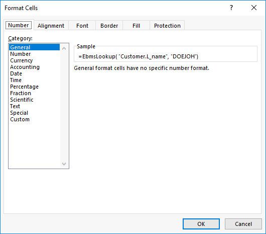 Result does not show properly: Prefix the root EBMS function with the '=' sign to communicate the result of the function into the specific spreadsheet cell: Example: =EBMSHistoryTotal( "GL.Difference", EbmsRange("50000-000", "59999-999", 2019, 4, 2019, 6) places the numeric result into the cell