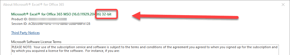The Excel Add-in requires the 32-bit version of MS Excel rather than the 64-bit version. Review the current version of MS Excel by selecting Account > About Excel from the main Excel menu as shown below: