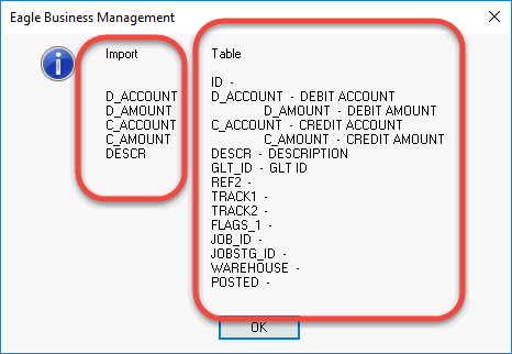 The following dialog will attempt to match the columns within the CSV file with the EBMS Table. The import tool expects the CSV file to contain the field names as shown below.