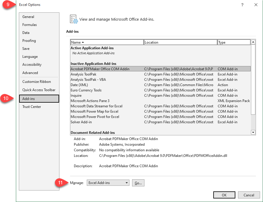 Select Excel Add-ins in the Manage drop-down and click Go.