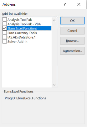 Ensure that the EbmsExcel.Functions option is selected and click OK.