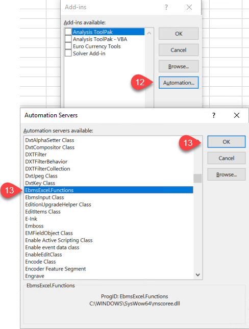 Click Automation to add the EbmsExcel.Functions option if it does not show on the available list.