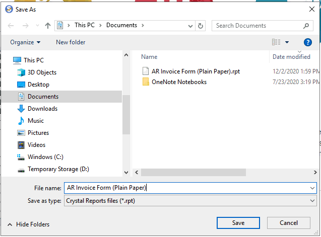 Click Save to create a Crystal Reports file (*.RPT) within the user's personal folder.