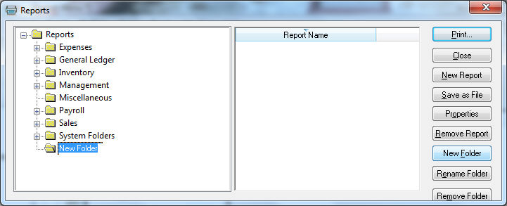 User defined report folders can be added by clicking on the New Folder button. Type the name of the new folder to identify the new group. Click on the Rename Folder or Remove Folder buttons to rename or remove report folders. Original report folder groups cannot be renamed or removed by the user.