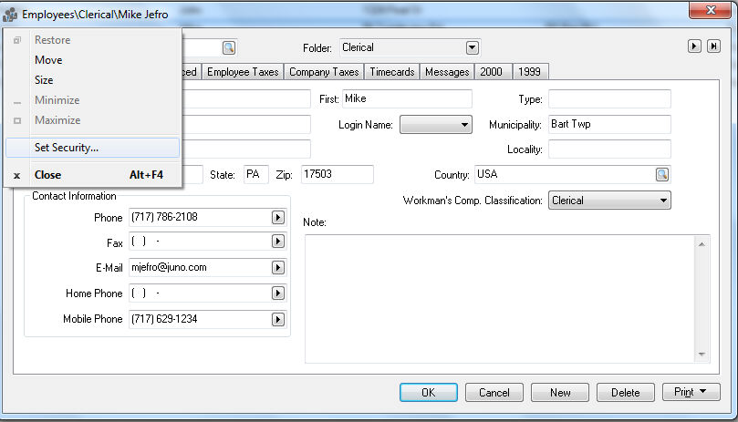 A user can be barred from a specific EBMS table or file by setting the security within the main entry dialog as shown below. In this example the employee entry dialog security setting sets the security for the worker table (PYEMP).