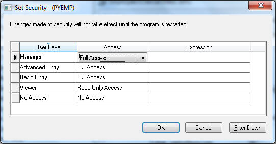 Set the Access security level for each User Level. This restricts the user within the current screen to the Access level that is set for his user level defined in File > User Management. The User Level options are: