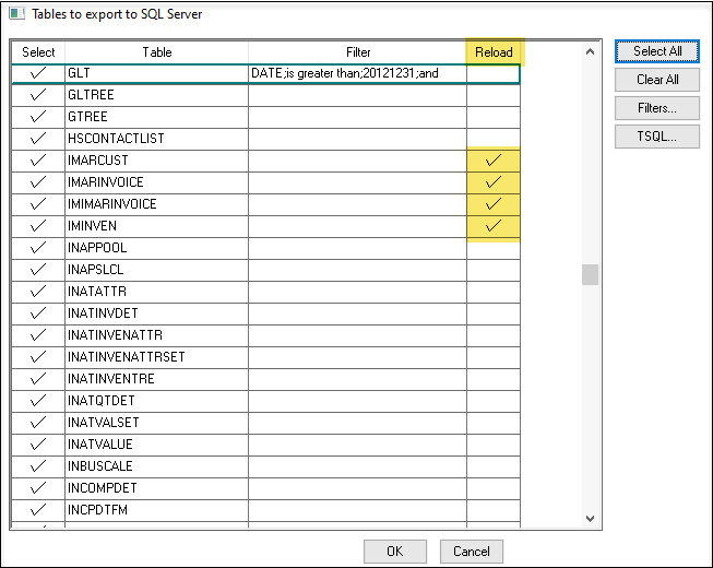 Enable Reload for tables that need to be uploaded again. This option will refresh the table data on the SQL Mirror.