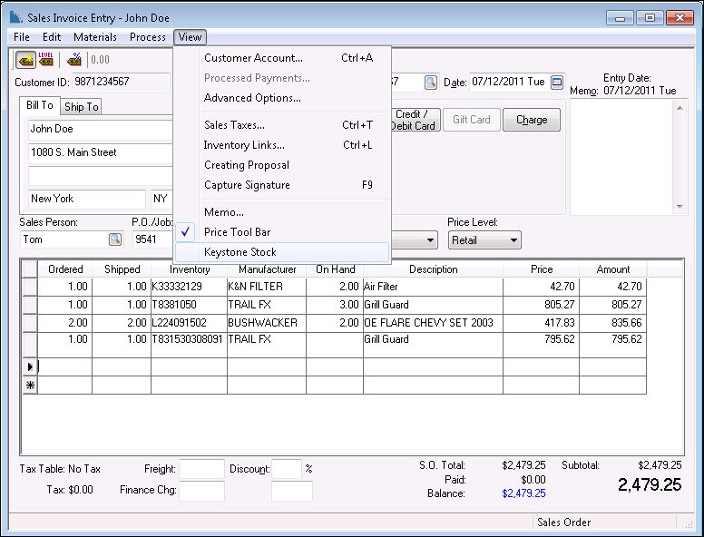 The user can check Keystone’s stock for all the items on the invoice screen by clicking View > Keystone Stock from the menu as shown below: