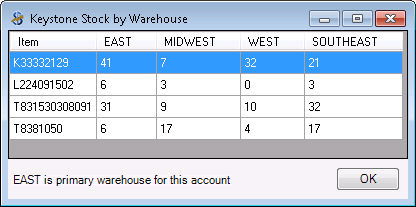 The Warehouse Stock Qty. shows the stock Keystone has at the different warehouses.