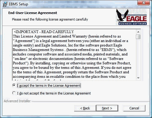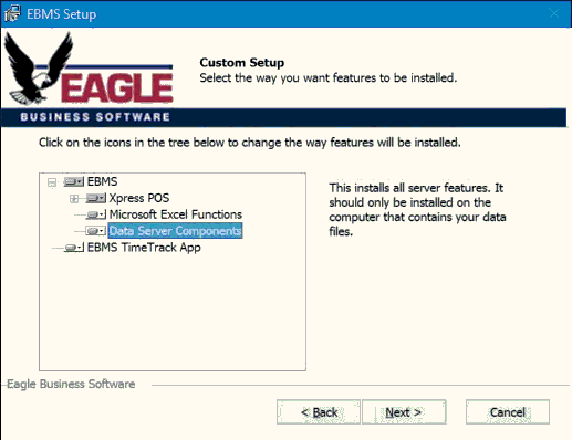 The Eagle Business Management System software is installed in two steps: A) installing the data and EBMS Server software on the main network or cloud server and B) install the client software on a computer or tablet. version, follow these steps: