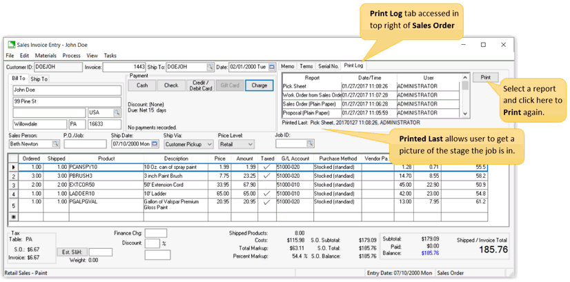 The Print Log feature built within EBMS allows the user the ability to quickly view the reports which have been printed for a given customer on a specific document.