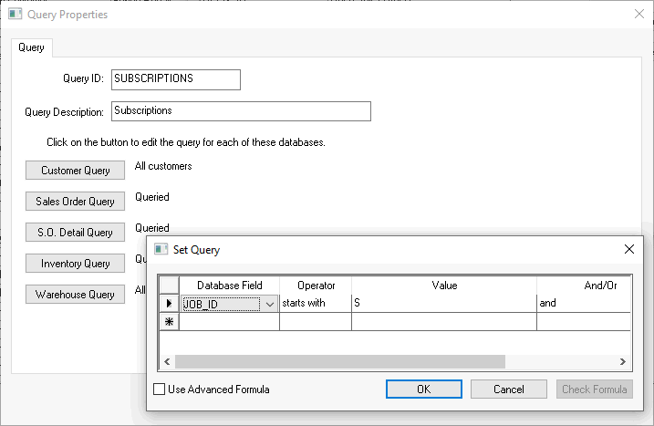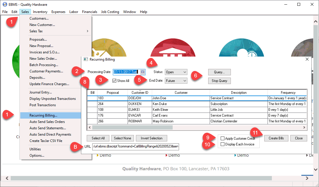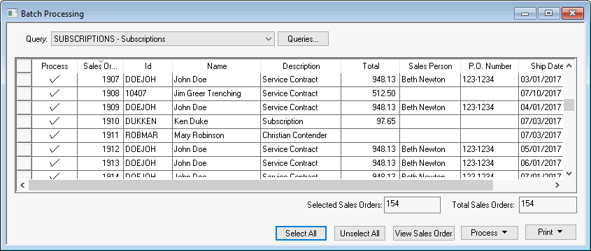 Although the user can view the sales order directly the recommended method is to review and process using the Batch Processing dialog launched by selecting from the main EBMS menu. Complete the following steps to configure the view query and process recurring invoices:
