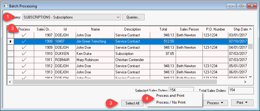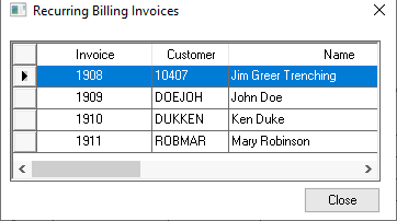 Select the sales orders to process by double clicking on a sales order or by clicking Select All to select all recurring billings listed.