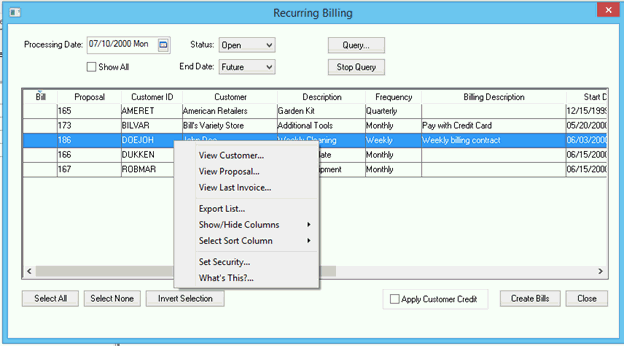 Manually create individual sales orders: A recurring invoice can be manually created by selecting from the proposal method or by clicking on the Create Recurring Bill button on the proposal screen. Review the Manually Create Recurring Invoice for details on this alternative method.
