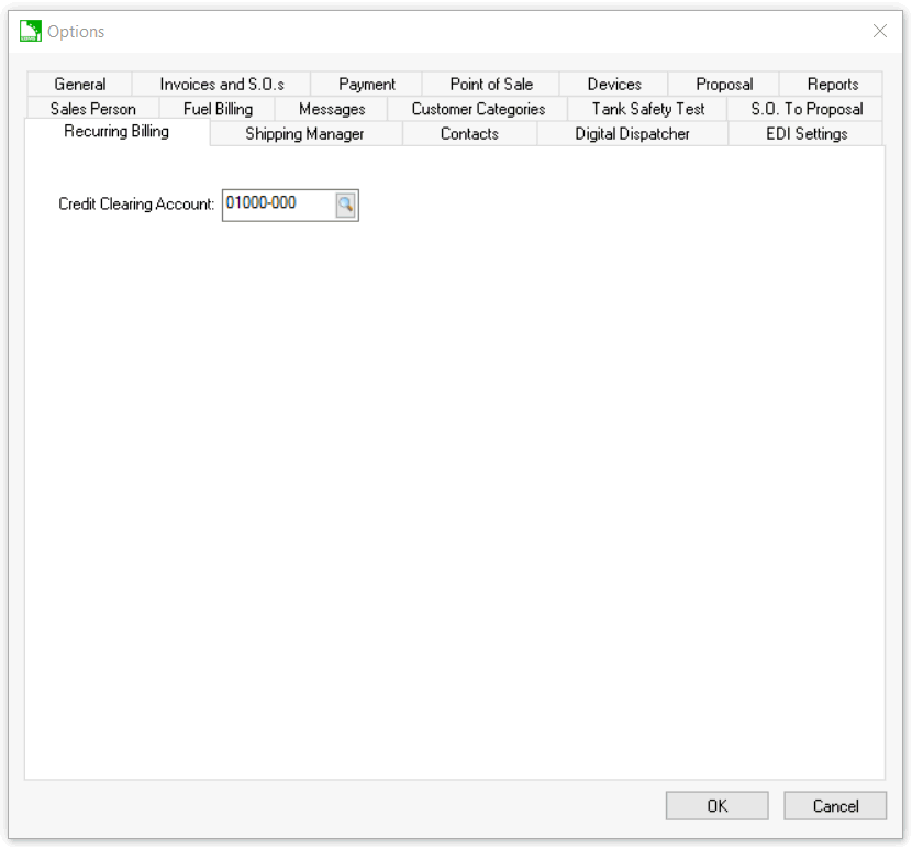 The Credit Clearing Account is only used when a credit is applied to a recurring billing invoice. It is recommended that the standard cash account is used for this setting. Review the Customer Payments > Payment Options section to review the cash account setting.