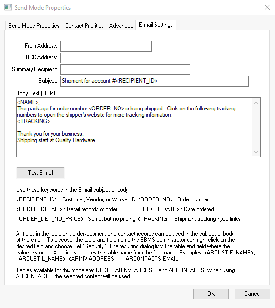 3. Enter the appropriate Body Text using HTML or plain text syntax. The <TRACKING> placeholder is used to list all tracking numbers associated with the order as well as a hyperlink for the shipper if the email is formatted to allow a hyperlink.  The keywords list located at the bottom of the dialog can be used within the e-mail body.  Note that line break tags (<br>) may cause extra lines in the E-mail.