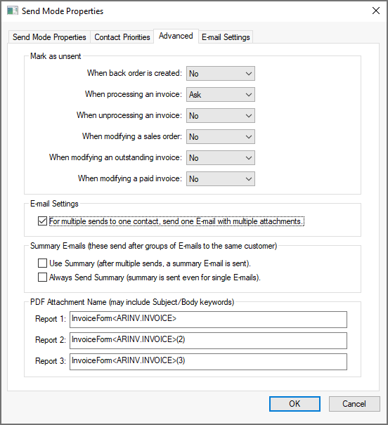 4. Set the PDF Attachment Name created by the reports configured in the Send Mode Properties.   User defined file names can be set for each of the corresponding reports set in the main property tab described previously in this section.