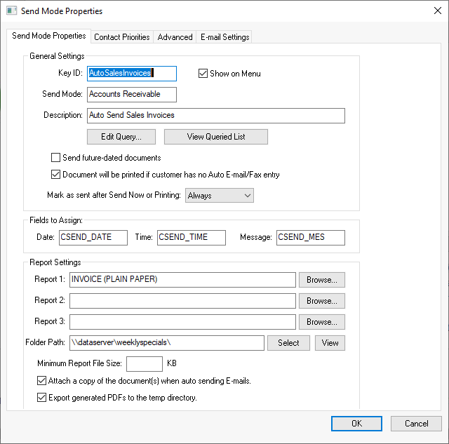 Review General Setup Instructions for more details on the Send Mode Properties.