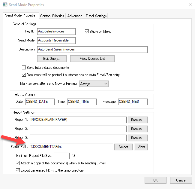 The default Folder Path of %Document% will print all documents associated with the selected document such as an invoice, customer, task, or other document identified in the Auto Send mode. Create a standard subdirectory in all document folders labeled \Print or other use defined subdirectory to limit printing to a specified subset of files. The Folder Path example shown above only includes files in the %Document%\Print directory. Note that the \Print subdirectory must be consistent for all included documents generated within this Auto Send mode.