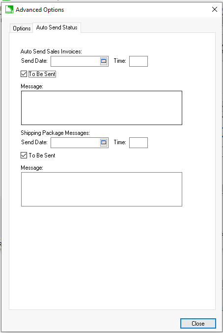 Select View > Advanced Options from the sales order or invoice menu and click on the Auto Send Status tab to view the status of the Auto Send: