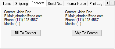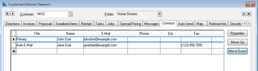 Contact information must be set up for all the customers before documents are sent. Go to Sales > Customers from the main EBMS menu and open a customer record. Click on the Contacts tab to view the contact list as show below. Enter a contact Title that matches the setting within the Contact Priorities dialog. Additional contacts can be added to this tab that are not related to any Auto Send modes.