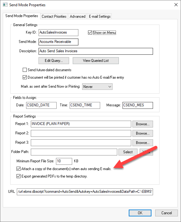 As the system handles each order, it will export a report in PDF format to the Export Folder. This PDF file will then be attached to an e-mail or fax and sent to the customer. The PDF attachment can be disabled (not recommended) if the content of the sales order is inserted directly into the main e-mail body. Go to the E-mail Settings tab of the Auto Send Mode dialog to review these options. Go to and select the Accounts Receivable mode to confirm that the Attach a copy of the document when auto sending E-mails option is enabled as shown below: