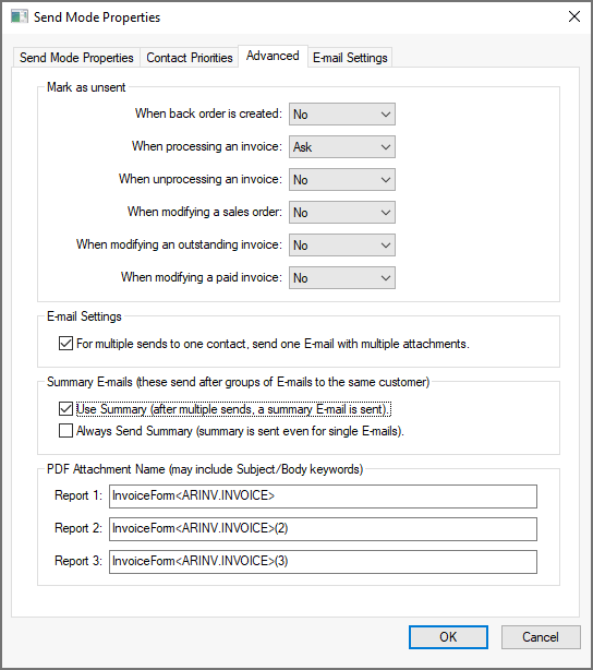 Set the PDF Attachment Name created by the reports configured in the Send Mode Properties. User defined file names can be set for each of the corresponding reports set in the main property tab described previously in this section.