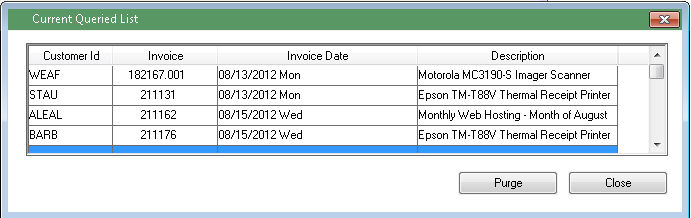 Click the Purge button to populate the Send Date for all invoices listed, removing them from the query. Use the Purge button to remove past invoices from the query. A purge is often required when a new query is created. Click the Close button.