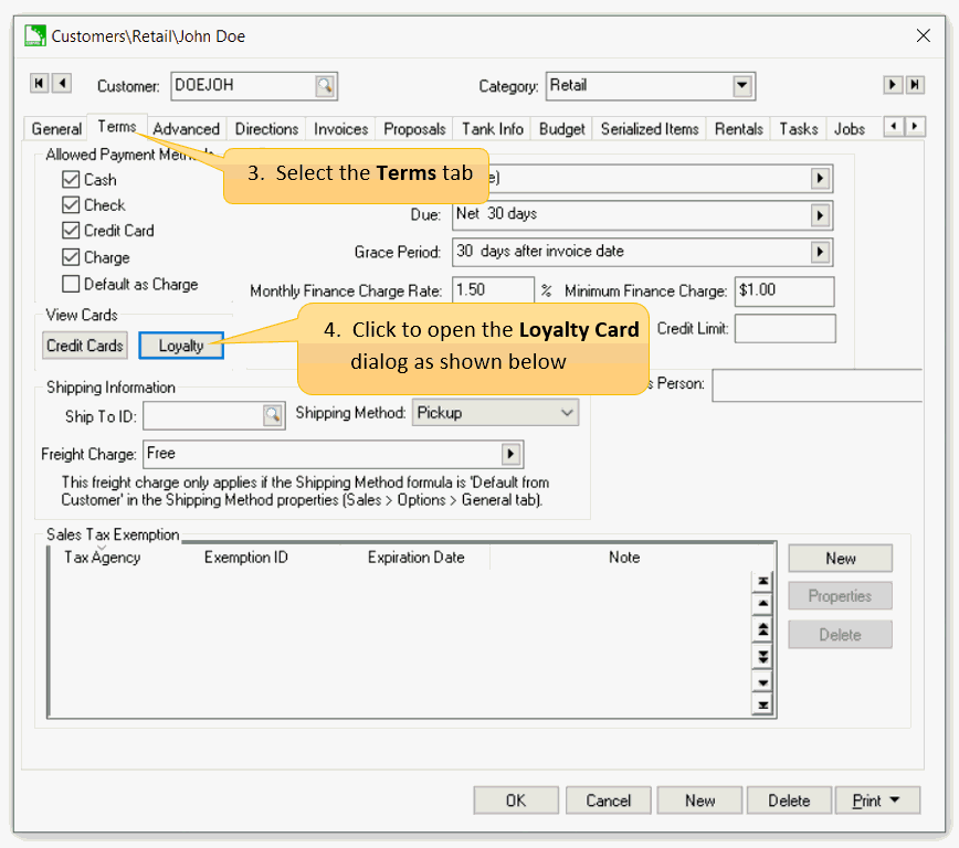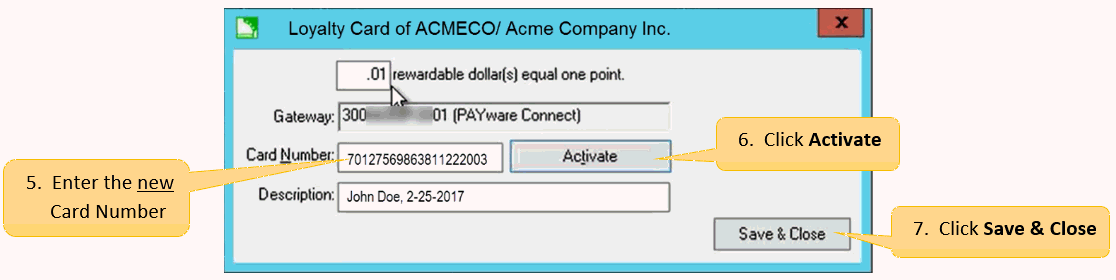 The following documentation gives instruction on how to modify a loyalty card that has already been activated. This step would be used to change the card number associated with a customer account in the event of a lost card or an activation mistake. Review the Configuring a Customer Record to Use a Loyalty Card section for more details on activating a loyalty card.