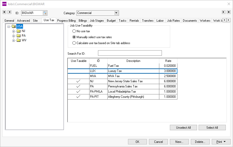 EBMS uses the job costing module to process use tax when it is consumed by a job. Use tax is required to be paid when product was purchased without sales tax for a job. Use tax must be paid if the job billings doe not included sales tax. This is common when a customer is billed for construction and other nontaxable services that include taxable parts or materials. Use tax must be paid based on the cost of the taxable products used within a non-taxable job.