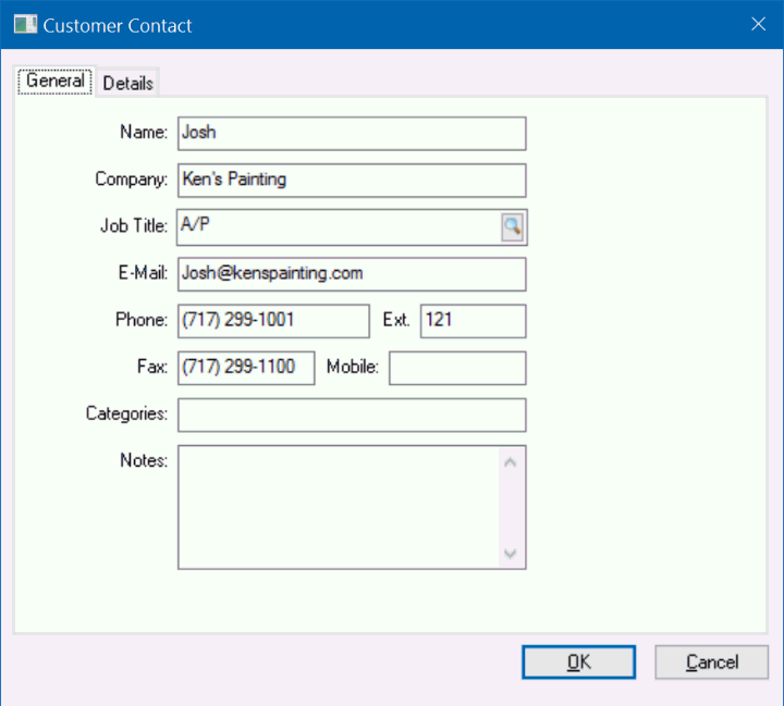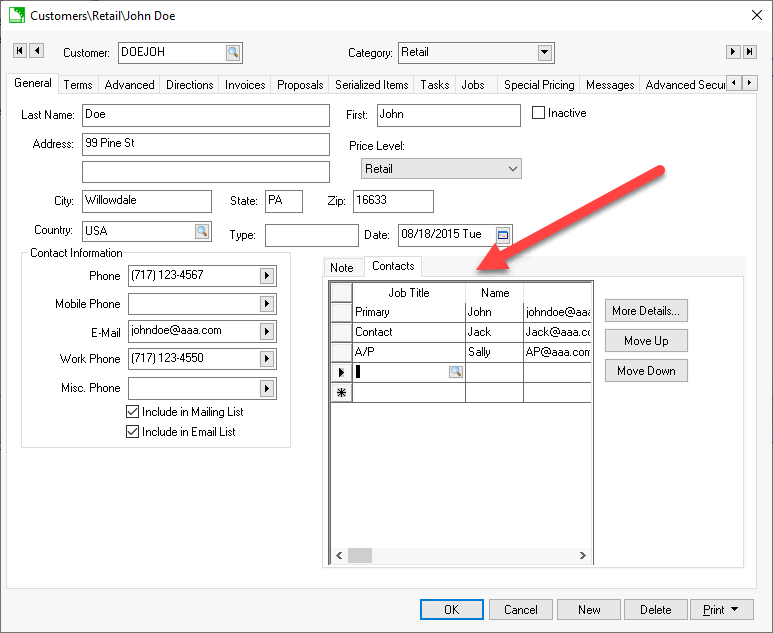 Contact specific information identifying individuals associated with a specific customer, vendor, or employee account can be entered. A customer record will be used here as an example. Complete the following steps to access the contact information for a customer: