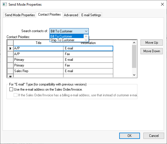 Set the priority order of the multiple contact priorities is top-down. In the above dialog, the recipient will be the A/P contact if the contact type exists with the customer's . if not, the recipient will be the E-mail contact, otherwise the document will be sent via the Fax service option.