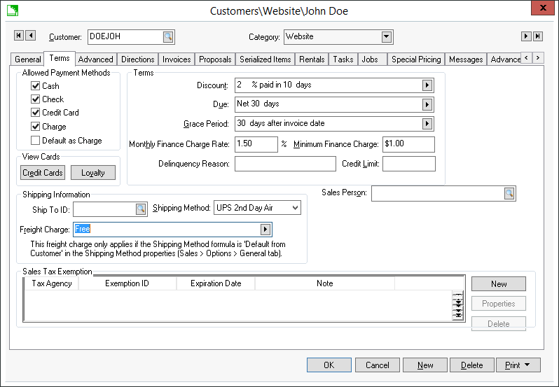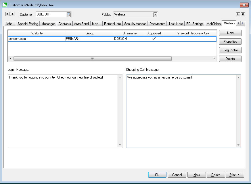 Website pricing, available products, and shopping cart settings can be controlled from the customer record. For example, the retail price may show on the web until a customer with a wholesale account logs into the site. After logging in, the wholesale account will not see the retail pricing. The customer's user name and password will be stored within the customer record. Review Advanced Options > User Created Customer Accounts for the option to allow the customer to create an account online.