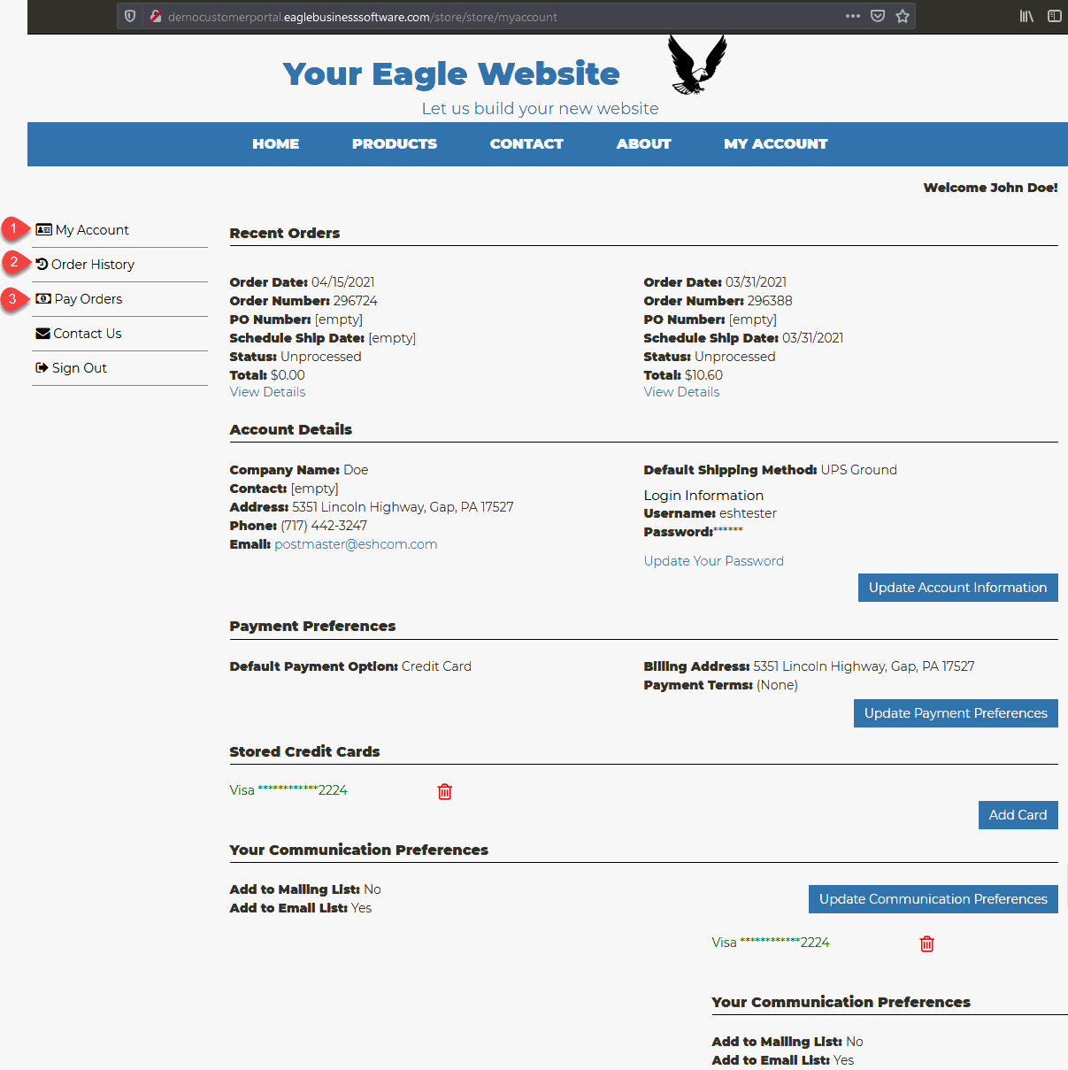 Click on Update Payment Preferences to add credit card information to an account in a secure manner. Review Saving Customer Credit Cards for details on the EBMS method of storing payment cards within an account.