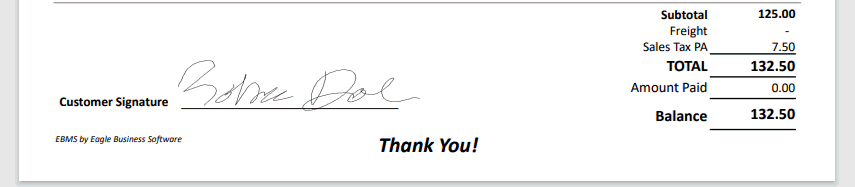 The Customer Signature Processing option is used to digitally capture a customers signature and record it within the EBMS sales proposal, sales order, or invoice. The signature may be a result of a proposal approval, charge invoice, or a credit card payment. The signature may be printed on the hard copy of a sales quote, invoice, or receipt. It may also be archived electronically for historical reference.