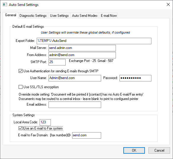 Auto Send e-mail and system settings must be configured before using the module. Global options should be set before using the Auto Send module is used even if user options are configured. Reference the following User Settings instructions for user specific settings in addition to the global settings. Do not use the Auto Send feature until the following settings are properly configured. Communicate with the company IT staff or Eagle Business Software representative for additional technical assistance.