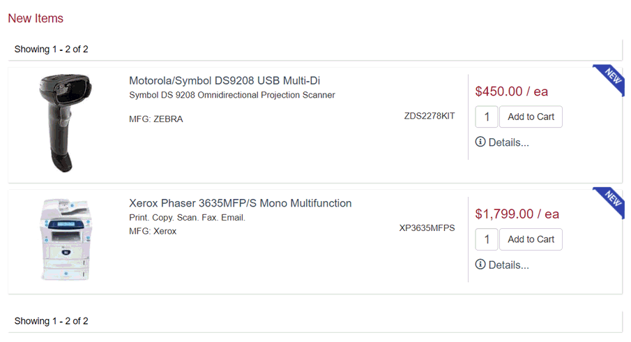 All items that are identified as new based on the entry date, will be displayed on the New Items page. This page name is identified as /store/newitems. Example: www.website.com/store/newitems. See page listing examples above. New items can also be queried, from the website url, by number of days since entry. This will query the new products based on X number of days since the entry date.