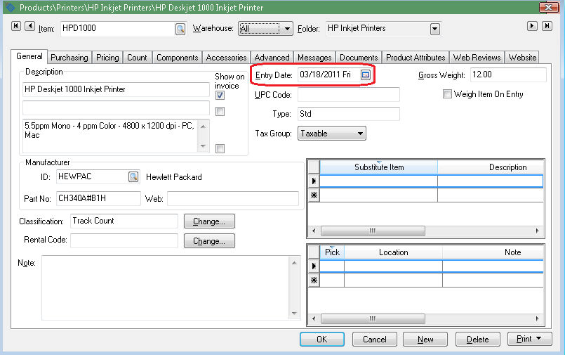 All items with an Entry Date that is equal to or less than the number of days from the current date will be tagged as new items. Open an inventory record and view the Entry Date setting within the General tab as shown below: