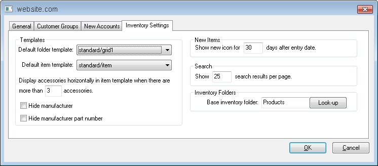 The amount of time that an inventory item is identified as new is set within the website options. Select Sales > Web > your company website from the main EBMS menu. Select the Inventory Settings tab.