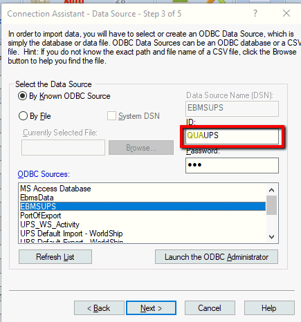 Set the EBMS user name as the ID and Password that is used to access EBMS data. The user name and password should be set with the same credentials as the ODBC driver. The user name must be prefixed with the 3 character EBMS Company ID found in File > Company Information > Advanced tab > Company ID. In the User Name example shown above, the QUA represents the Company ID and the UPS text is the user name. Review the [Main] Getting Started > Security > Creating Users and Assigning Rights for more details on creating users and setting passwords.