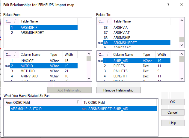 Since the main EBMS shipment export table is ARSMSHIP, select ARSMSHIP within the Relate Frompane and Relate To: file of ARSMSHIPDET as shown above.