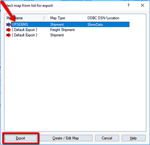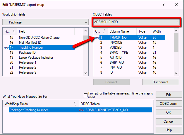 Export map will copy data to the EBMS ARSMSHIPINFO table using the WorldSSelect the ARSMSHIP from the ODBC Tables drop down.