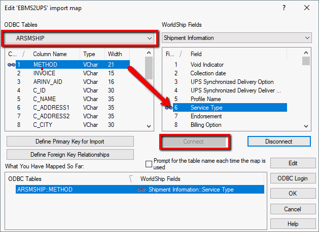 Click the Connect button to associate the EBMS field to the WorldShip field.
