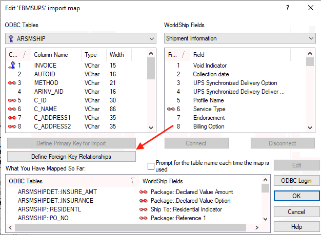 Connect each EBMS ODBC field within the ARSMSHIP table with the corresponding WorldShip > Package field as listed in the mapping table at the end of this section.