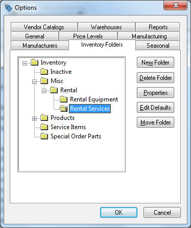 Save the inventory defaults and return to the inventory folder tab of Sales > Options > Product Categories by clicking on the OK button. Review the Creating Rental Service Codes section for steps in creating the rental service codes.