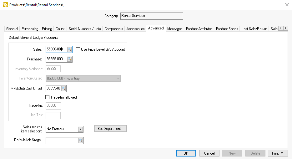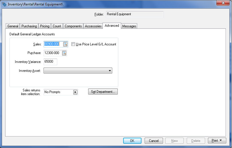 Disable the Use Price Level G/L Account option and enter the rental income general ledger account into the Sales account. The Purchase, Inventory Variance, general ledger codes can be ignored under normal circumstances. Review the Inventory Items > Changing Inventory Defaults section of the Inventory documentation for more details on the Advanced tab settings.