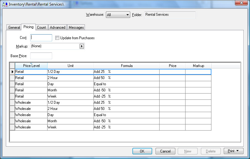 Set the pricing Formulas accordingly. Review the Creating Rental Service Codes section for more details on pricing. All the Cost and Prices should be kept blank within the default setting dialog.